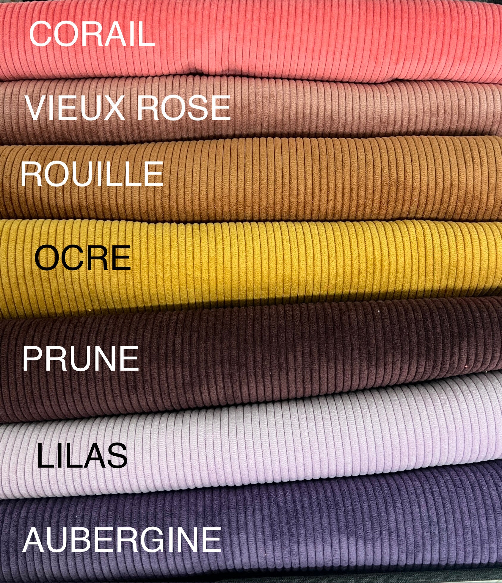 Blanc, beige, noir, anthracite, doré, jaune bordeaux, terracotta, canard, vert, aubergine, corail, bleu roi, prune