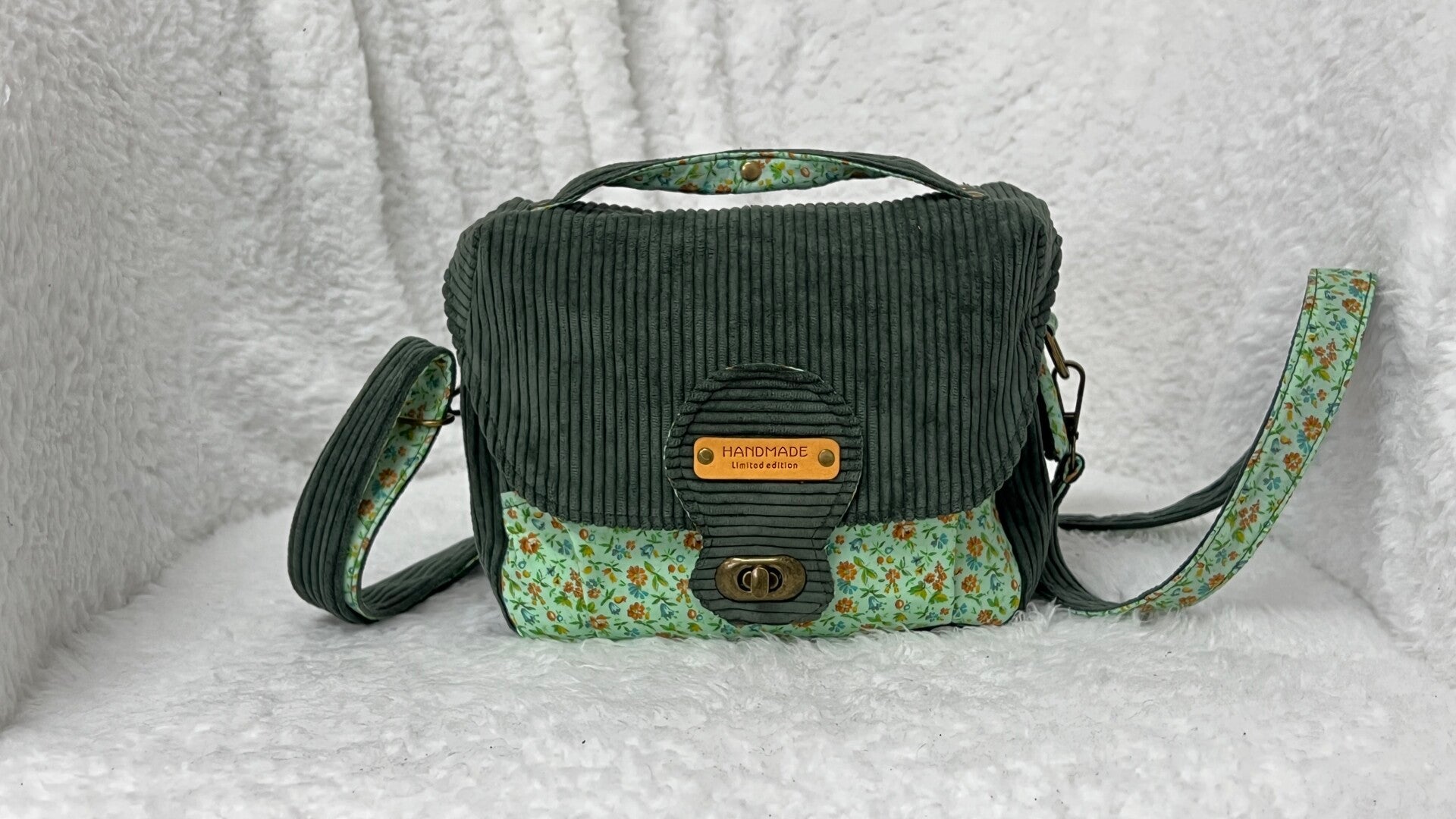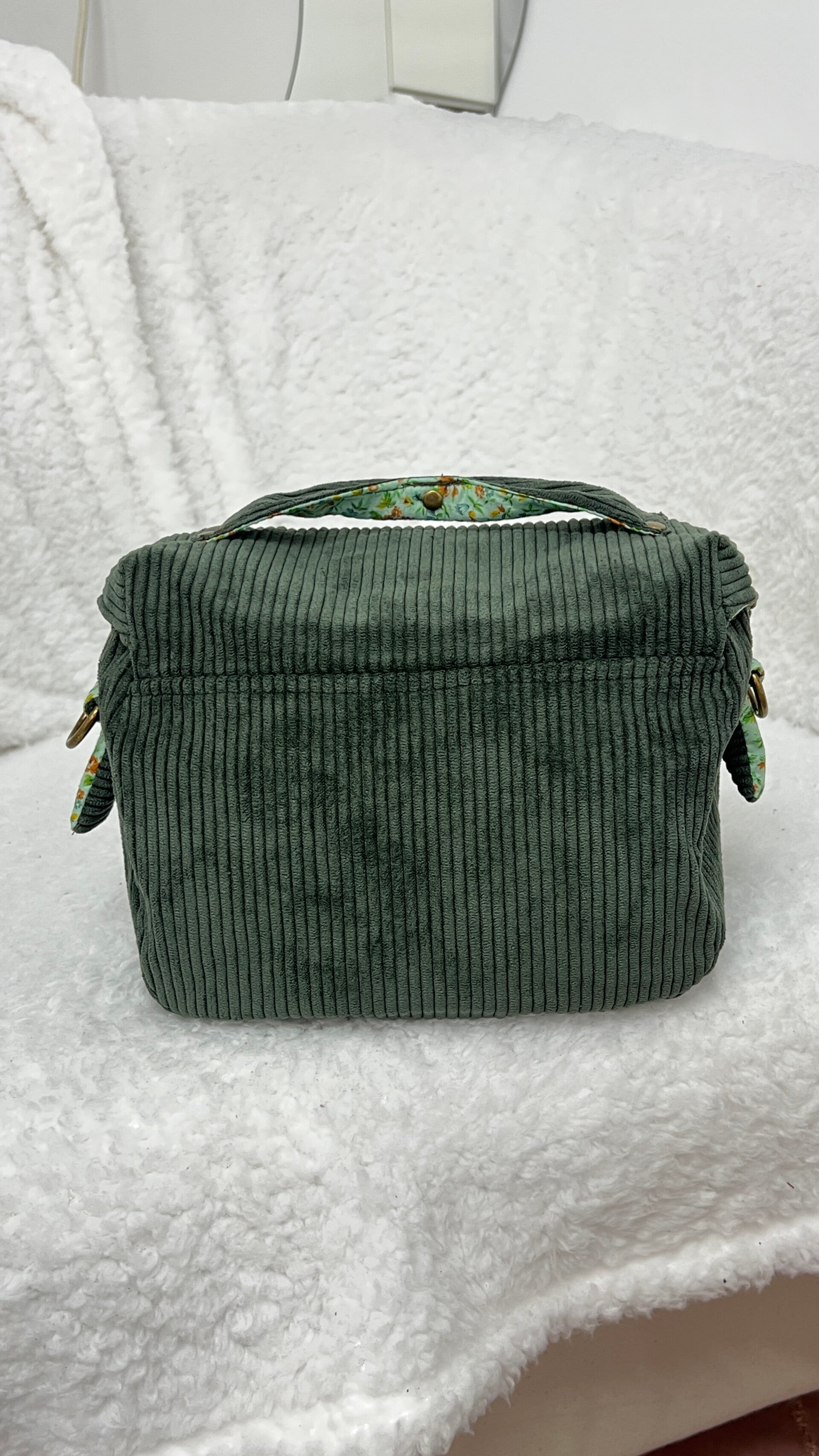 Le sac à main bandoulière amovible – Happy velours kaki est un sac compact en velours côtelé kaki, doublé d’un tissu fleuri vert. Rabat arrondi avec fermoir tourniquet finition laiton.